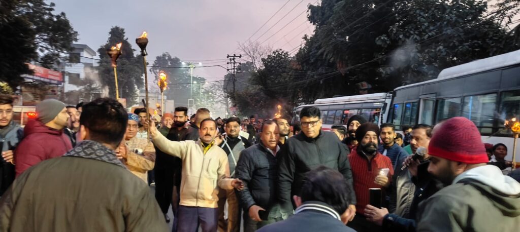 आज संयुक्त व्यापार संघर्ष समिति द्वारा मशाल जलुस निकाला गया, जिसमें भारी संख्या में व्यापारी शामिल हुए, कल से प्रभावित व्यापारियों की दुकान सायं 4 बजे से बंद रखकर धरना प्रदर्शन किया जायेगा, आज के जलुस में छेत्रीय विधायक सुमित हिर्देश ने पहुचकर अपना समर्थन देते हुए कहा कि जो व्यापारी इस समय अपनी दुकानों में होना चाहिए था वो सड़कों में मशाल जलुस निकाल रहा है जिसकी पूरी जिम्मेदारी शासन प्रशासन की है,सन 1950 से इस छेत्र व्यापार कर रहे व्यापारी को अतिक्रमण कारी बता कर जिला प्रशासन नाइंसाफी कर रहा है यदि इन्हें शहर का सौन्दरिकरण करना ही था तो पहले आई एस बी टी बनाते, रिंग रोड बनाते फिर यदि आवश्यक होता तो बाजार की रोड़ों को छोड़ा किया जाता ,लेकिन व्यापारियों की दुकानों को तोड़कर शहर का सौन्दरिकरण की बात बेईमानी है हम पीड़ित व्यापारियों के साथ कंधे से कंधा मिलाकर खड़े है,