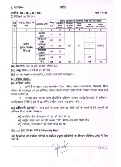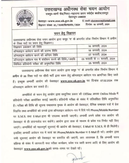 उत्तराखण्ड अधीनस्थ सेवा चयन आयोग द्वारा समूह ‘ग’ के अन्तर्गत लोक निर्माण विभाग में अमीन के 88 रिक्त पदों पर सीधी भर्ती द्वारा चयन हेतु ऑनलाइन आवेदन पत्र आमन्त्रित किए जाते हैं। इच्छुक अभ्यर्थी आयोग की वेबसाइट www.sssc.uk.gov.in पर दिनांक 07.02.2024 तक ऑनलाइन आवेदन कर सकते हैं।अभ्यर्थियों के चयन हेतु आयोग द्वारा वस्तुनिष्ठ प्रकार की Offline अथवा Online Mode में प्रतियोगी परीक्षा आयोजित कराई जाएगी। प्रतियोगी परीक्षा के संबंध में उल्लिखित तिथि अनुमानित है।