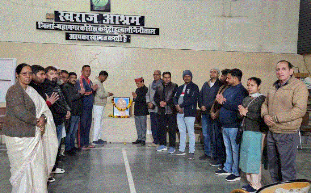 राष्ट्रपिता महात्मा गाँधी के शहादत दिवस पर आज हल्द्वानी महानगर कांग्रेस ने स्वराज आश्रम में बापू जी के चित्र पर पुष्पांजलि अर्पित करने के उपरांत स्वतंत्रता संग्राम में अपने जीवन का बलिदान देने वाले शहीदों की स्मृति में 2 मिनट का मौन रख श्रद्धांजलि अर्पित कर 30 जनवरी को सदभावना दिवस के रूप में मनाया। जिलाध्यक्ष राहुल छिमवाल और महानगर अध्यक्ष एडवोकेट गोविंद सिंह बिष्ट ने कहा कि राष्ट्रपिता महात्मा गाँधी जी द्वारा सत्य और अहिंसा का जो मार्ग हम सबको दिखाया,