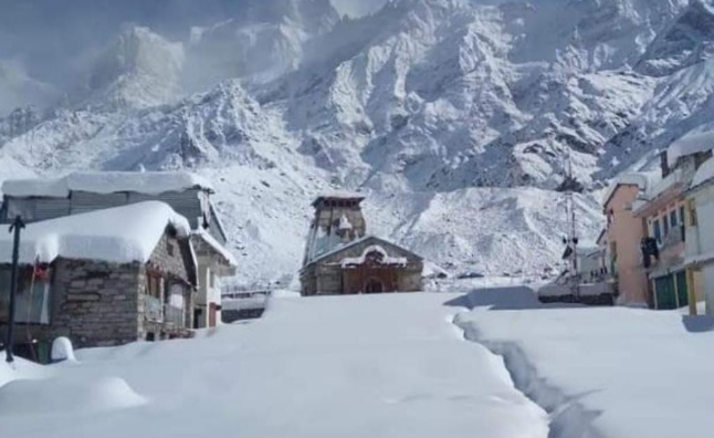 सुबह मौसम साफ होते ही चमकती धूम के साथ श्री केदारनाथ धाम सहित ऊंची पहाडीयों मे चाँदी सी चमक रही है बर्फ