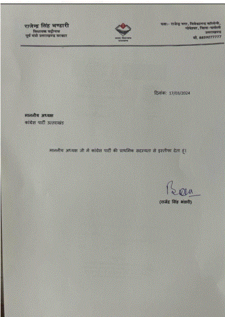 लोक सभा चुनाव से पहले कांग्रेस के बद्रीनाथ विधायक राजेंद्र भंडारी ने कांग्रेस को अलविदा कर दिया है