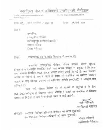 तथा निजी सम्पत्ति पर भी बैनर, पोस्टर, वॉल पेन्टिंग आदि सम्बन्धित भू-स्वामी की अनुमति के बिना नहीं लगायेगा/लिखेगा।उन्होंने कहा कि कोई भी राजनैतिक दल मतदान की तिथि 19 अप्रैल, 2024 को मतदान केन्द्र से 200 मी० की दूरी के अन्तर्गत अपने अभिकर्ताओं को नहीं रखेगा, न ही वोटर को ले जाने के लिए किसी प्रकार के वाहनों का प्रयोग करेगा। दिव्यांग व्यक्ति पर यह प्रतिबन्ध लागू नहीं होगा। उन्होंने कहा कि चुनाव आदर्श आचार संहिता एव भारत निर्वाचन आयोग द्वारा निर्गत निर्देशों का प्रत्येक राजनैतिक/अधिकारी/व्यक्ति को कड़ाई से अनुपालन करना होगा। यह आदेश 04 जून, 2024 तक समस्त जनपद नैनीताल की सीमा के अन्तर्गत प्रभावी रहेगा