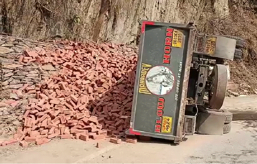 टनकपुर से पिथौरागढ़ को ईट लेकर जा रहा डंपर Uk03CA 2039 लोहाघाट पिथौरागढ़ एनएच में भारतोली में बुधवार देर रात 1:00 बजे के आसपास अचानक अनियंत्रित होकर दीवार से टकराकर सड़क में पलट गया