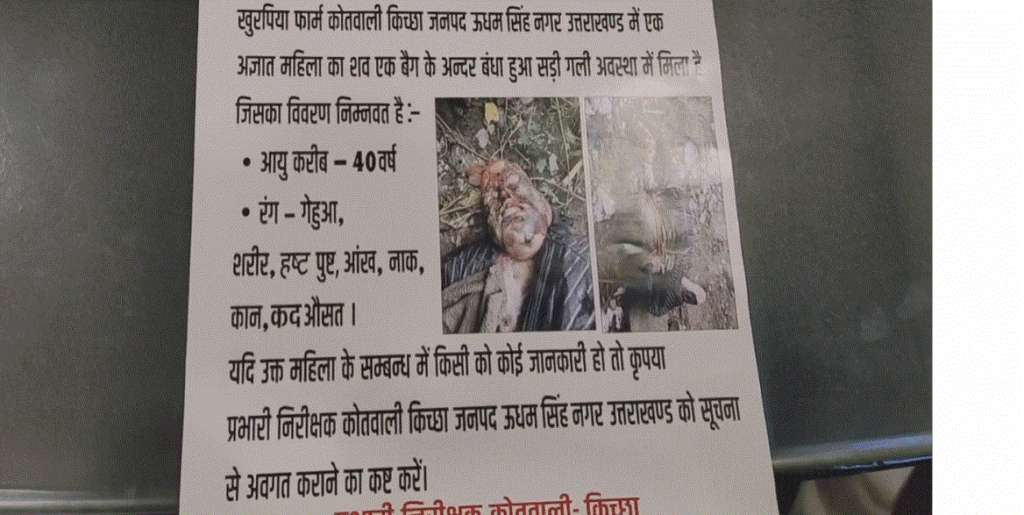 कि बरामद महिला का शव करीब 5 दिन पुराना होने के चलते बुरी तरह से सड़ चुका था। सड़ी अवस्था में शव बरामद होने के चलते महिला की पहचान नहीं हो पाई। संभावना जताई जा रही है कि अज्ञात लोगों द्वारा महिला की हत्या करने के बाद उसके शव को बैग में डालकर किच्छा क्षेत्र में ठिकाने लगा दिया गया। एसपी सिटी मनोज कुमार कत्याल ने बताया कि घटना के खुलासे के लिए पांच पुलिस टीम लगाई गई है तथा सीमावर्ती क्षेत्रों में संपर्क कर गुमशुदा महिलाओं की सूची तैयार कर महिला की पहचान करने का लगातार प्रयास किया जा रहा है।