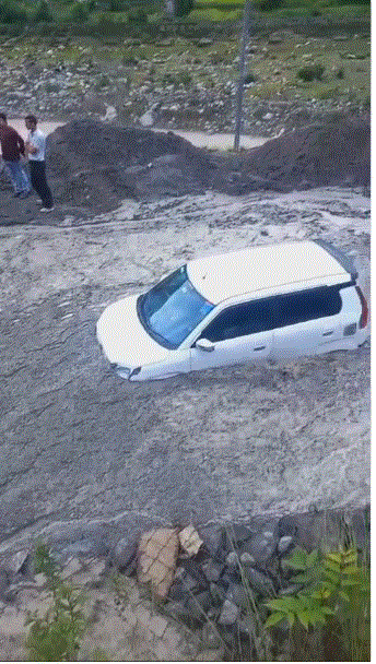 यहां पर उत्त्तरकाशी से गंगोत्री की ओर जा रही एक वैगनार कार मलबे में फंसी है।