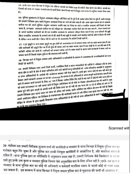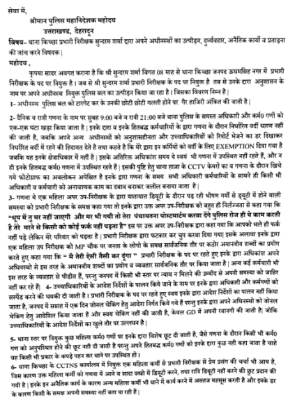 वायरल पत्र में शिकायतकर्ता के तौर पर किच्छा कोतवाली के समस्त पुलिसकर्मी लिखा गया है। जबकि एक भी पुलिसकर्मी का पत्र में नाम अंकित नहीं है। चर्चाओं के अनुसार गुमनाम पत्र के माध्यम से किच्छा कोतवाली प्रभारी सुंदरम शर्मा के खिलाफ पुलिस महानिदेशक को पत्र प्रेषित किए जाने का दावा किया जा रहा है। प्रेषित पत्र में कोतवाल सुंदरम शर्मा पर किच्छा कोतवाली में तैनात अधीनस्थ पुलिसकर्मियों को टारगेट कर छोटी-छोटी गलतियों पर गैर हाजिर अंकित करने, अधीनस्थों को सस्पेंड करने की धमकी देकर सार्वजनिक रूप से अपमानित करने, प्रेम प्रसंग, पुलिस कर्मियों के साथ अभद्रता करने, रिपोर्ट भेजने के नाम पर उत्पीड़न, महिला पुलिस कर्मियों से अभद्र भाषा का उपयोग, खनन एवं शराब कारोबारी को थाने बुलाकर अवैध वसूली, पुलिस कर्मियों को अवकाश के लिए परेशान करने, गंभीर घटना होने के बावजूद घटनास्थल पर कोतवाल के अनुपस्थित होने सहित तमाम गंभीर आरोप लगाए गए हैं।