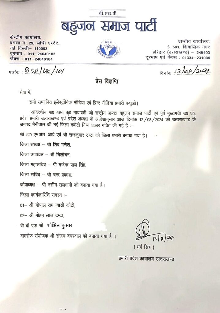 जिसके चलते हल्द्वानी क्षेत्र के बहुजन समाज पार्टी में सक्रिय नेता शिव गणेश जी को फिर एक बार जिला अध्यक्ष बनाया गया है वही शिव गणेश को बहुजन समाज पार्टी का जिला अध्यक्ष बनाए जाने पर बहुजन समाज पार्टी के कार्यकर्ताओं में काफी उत्साह और जो दिखाई दिया