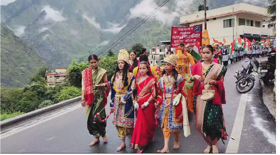 अमर वीर जवानों और वीर नारियों की प्रतीकात्मक वेश भूषा के साथ नरसिंह मंदिर से लेकर बद्रीनाथ टैक्सी स्टैंड