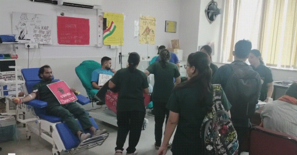 चिकित्सक कोलकाता कांड में ट्रेनी डॉक्टर के साथ हुई घटना से आहत हैं और न्याय की मांग कर रहे हैं। इस कड़ी में उन्होंने ट्रामा सेंटर में एक रक्तदान शिविर का आयोजन किया, जिसमें कई चिकित्सकों ने रक्तदान कर अपने आक्रोश को व्यक्त