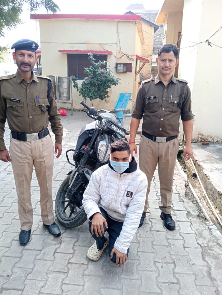 पुलिस टीम ने थाना क्षेत्र के आसपास लगे 100 से अधिक सीसीटीवी कैमरों का अवलोकन किया और अभियुक्त की पहचान कर इसके बाद सुरागरसी और पतारसी करते हुए दिनांक 05/12/2024 को अभियुक्त निशुतोष भंडारी उर्फ नीलू पुत्र मनोज सिंह भंडारी, निवासी चंदन कोचिंग सेंटर के पास, इंदिरा नगर सेकंड बिन्दुखत्ता लालकुआं को गोला नदी किनारे रावत नगर को जाने वाले रास्ते से चोरी की गई मोटरसाइकिल के साथ गिरफ्तार किया।