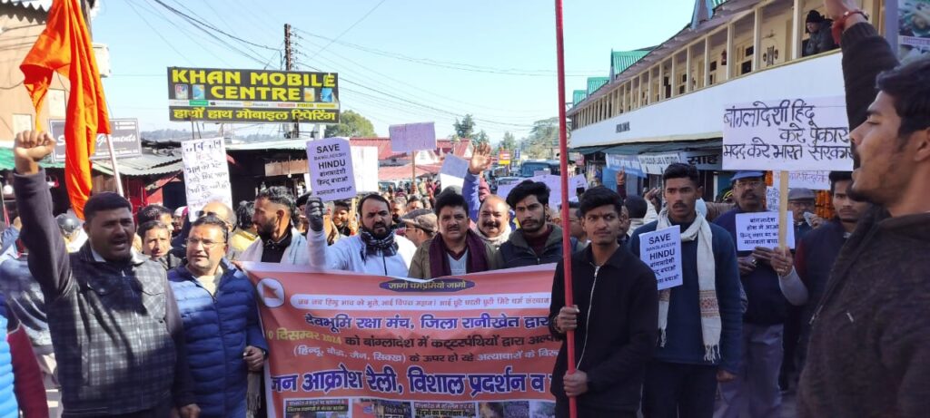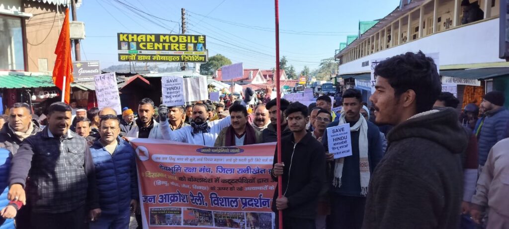 बांग्लादेश में हिंदुओं पर हो रहे अत्याचार को देखते हुए देवभूमि रक्षा मंच के तत्वावधान में मंगलवार को नगर में जन आक्रोश रैली का आयोजन किया गया। जिसमें विधायक डॉ प्रमोद नैनवाल सहित तमाम संगठनों सदस्यों, पदाधिकारियों और आम जनता ने बढ़ -चढ़कर प्रतिभाग किया। रैली में पहुंचे वक्ताओ ने भारत सरकार से बांग्लादेश में हिंदुओं पर हो अत्याचार के खिलाफ कड़ी कार्रवाई की मांग की।
