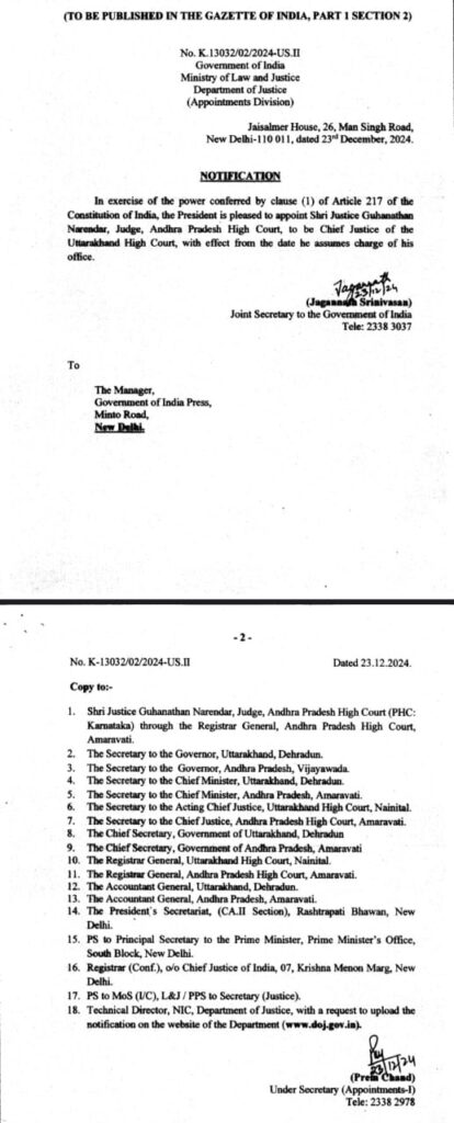भारत सरकार के लॉ एंड जस्टिस, डिपार्टमेंट ऑफ जस्टिस की तरफ से जारी पत्र की एक कॉपी आंध्र प्रदेश उच्च न्यायालय के रजिस्ट्रार जर्नल के माध्यम से न्यायाधीश गुहानाथन नरेंद्र के साथ आंध्र प्रदेश और ऊत्तराखण्ड के राज्यपाल के सचिव, आंध्र प्रदेश