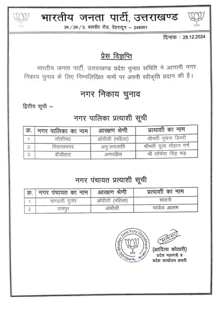 भाजपा ने आज अपनी दूसरी लिस्ट भी जारी कर दी भाजपा की इस दूसरी लिस्ट में भी हल्द्वानी और रुद्रपुर नगर निगम प्रत्याशियों के नाम नहीं खोले गए हैं