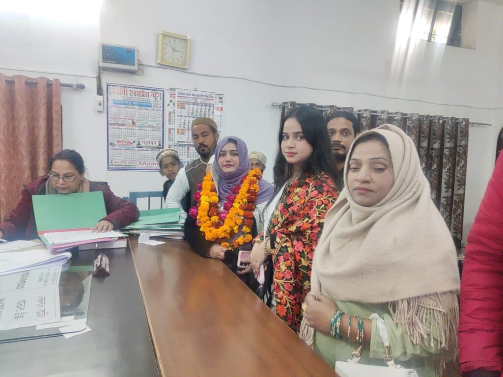 आयशा कुरैशी वार्ड नंबर 25 की निर्दलीय प्रत्याशी हैं हजारों की संख्या में अपने समर्थकों के साथ चुनाव चिन्ह लेने पहुंची वह