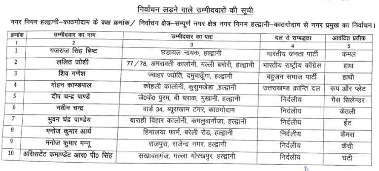 हल्द्वानी नगर निगम में मेयर पद के लिए कुल दस दावेदार चुनावी मैदान में हैं। चुनाव चिन्ह मिलते ही सभी प्रत्याशियों ने चुनाव प्रचार तेज कर दिया है, और शहर में चुनावी गतिविधियां भी बढ़ गई हैं।