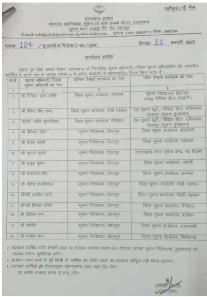 गिरिजा शंकर जोशी जिला सूचना कार्यालय चम्पावत से मिडिया सेंटर हल्द्वानी से हुए संबद्द तो प्रियंका जोशी सूचना निदेशालय देहरादून से जिला सूचना अधिकारी नैनीताल बनी, जबकि जिला सूचना अधिकारी नैनीताल ज्योति सुंदरियाल को मिडिया सेंटर सचिवालय देहरादून भेजा गया।