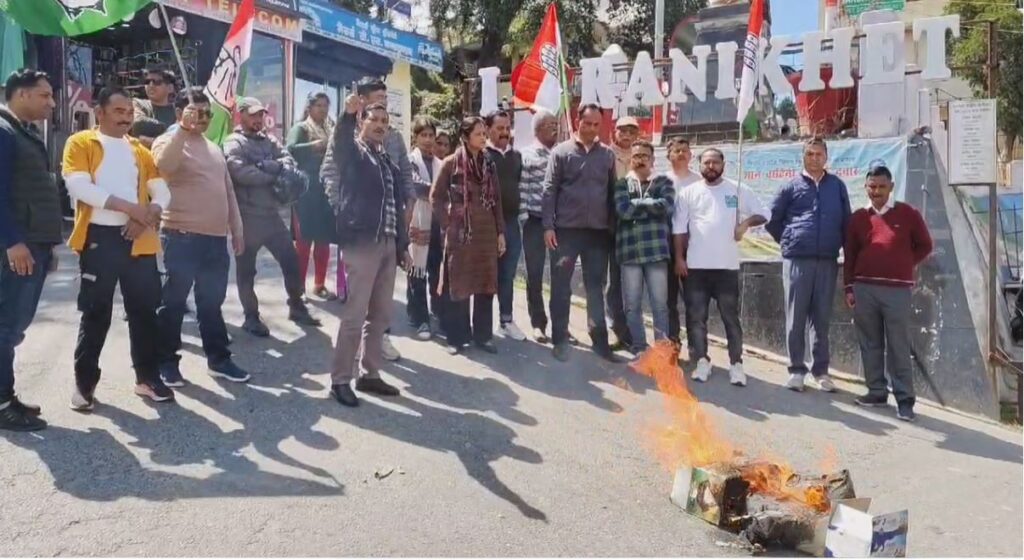 ताड़ीखेत विकासखण्ड के ग्रामीण क्षेत्र में नई शराब की दुकानें खोलने के विरोध में कांग्रेस ने सीएम धामी व विधायक प्रमोद नैनवाल का पुतला दहन किया