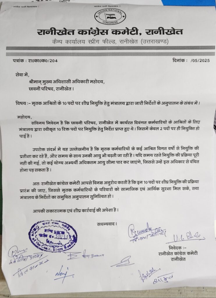 नगर कांग्रेस कमेटी ने सोमवार को छावनी परिषद रानीखेत के मुख्य अधिशासी अधिकारी कुनाल रोहिला से मुलाकात कर मृतक आश्रितों की नियुक्ति को लेकर ज्ञापन सौंपा। ज्ञापन में मांग की गई कि मंत्रालय द्वारा स्वीकृत 10 रिक्त पदों पर जल्द से जल्द नियुक्ति की जाए ताकि दिवंगत कर्मचारियों के परिजनों को न्याय और राहत मिल सके।