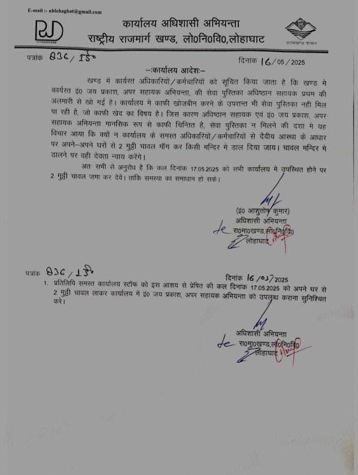 राष्ट्रीय राजमार्ग (एनएच) निर्माण खंड लोहाघाट के अधिशासी अभियंता आशुतोष कुमार के नाम से जारी एक अजीबोगरीब आदेश इन दिनों चर्चा का विषय बना हुआ है। इस कथित आदेश में विभाग के सभी अधिकारियों व कर्मचारियों को निर्देश दिए गए कि वे 17 मई तक दो-दो मुट्ठी चावल (अक्षत) किसी मंदिर में चढ़ाएं, ताकि गुम हुई सेवा पुस्तिका को देवी-देवताओं की कृपा से खोजा जा सके।