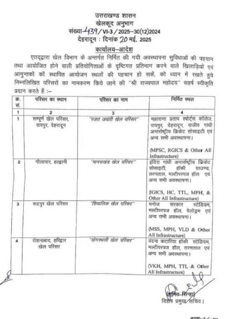 - देहरादून का “महाराणा प्रताप स्पोर्ट्स कॉलेज” अब “रजत जयंती खेल परिसर” के नाम से जाना जाएगा।