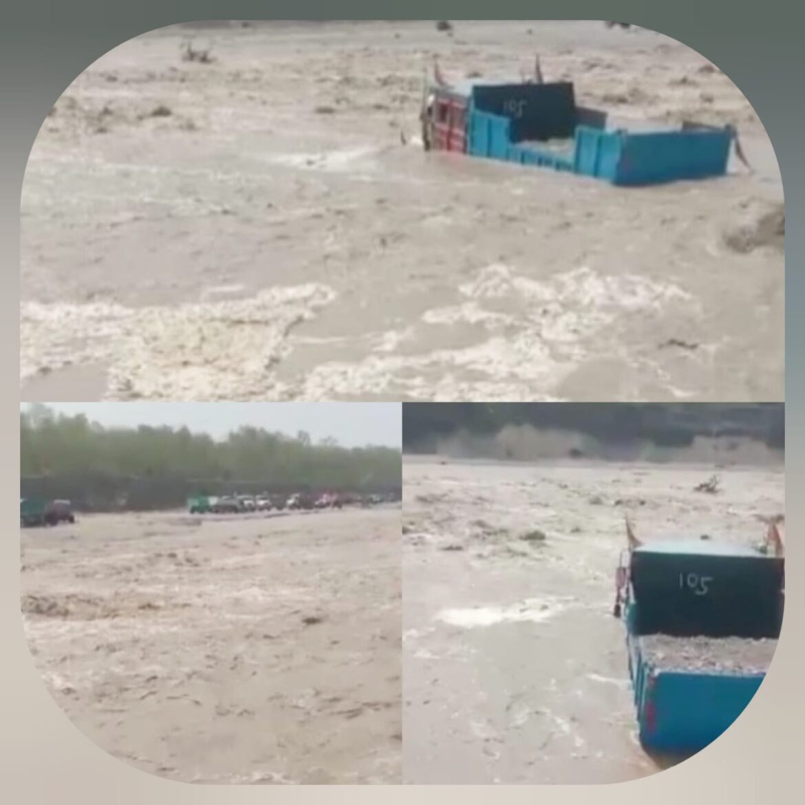 प्राप्त जानकारी के अनुसार, नदी में आए तेज बहाव के चलते खनन कार्य में लगे कई डंपर पानी में बह गए, वहीं कुछ ट्रक नदी में डूब गए हैं। हालांकि वाहन चालकों और मजदूरों ने सूझबूझ दिखाते हुए दौड़कर जान बचा ली, जिससे एक बड़ी त्रासदी टल गई।
