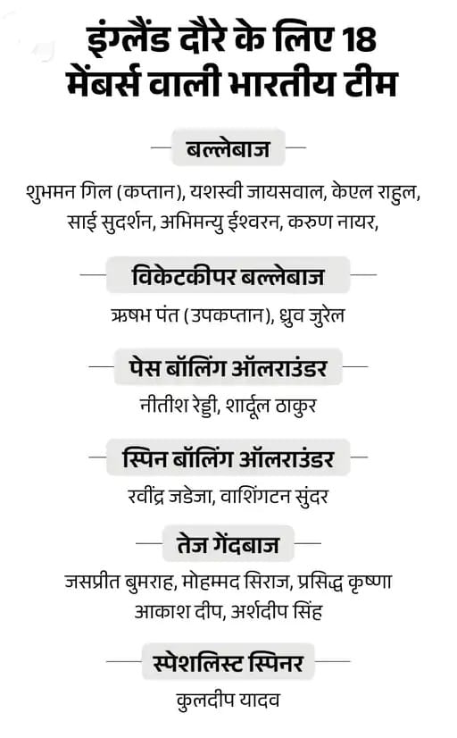 टीम इंडिया – इंग्लैंड टेस्ट सीरीज 2025 के लिए 18 सदस्यीय स्क्वॉड: