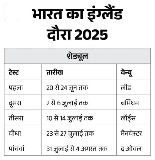 भारत और इंग्लैंड के बीच पांच मैचों की टेस्ट सीरीज़ 20 जून से शुरू होगी। इस दौरे में युवा और अनुभवी खिलाड़ियों का संतुलन देखने को मिला है, वहीं विराट कोहली और रोहित शर्मा जैसे दिग्गजों के रिटायरमेंट के बाद टीम में नए चेहरों की एंट्री हुई है।
