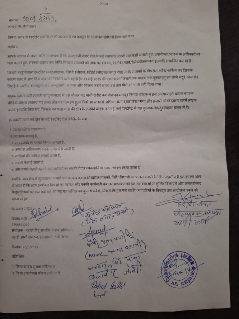 हल्द्वानी शहर में बढ़ती अव्यवस्था और अवैध पार्किंग के खिलाफ आज पहाड़ी आर्मी के पदाधिकारियों ने उपजिलाधिकारी कार्यालय पहुंचकर ज्ञापन सौंपा। संगठन ने ज्ञापन में आरोप लगाया कि प्रशासन द्वारा चलाए जा रहे अतिक्रमण विरोधी अभियानों में केवल फड़, रेहड़ी व ठेली वालों को निशाना बनाया जा रहा है, जबकि शहर की बड़ी व्यापारिक इकाइयों को बख्शा जा रहा है।