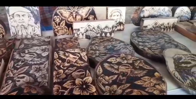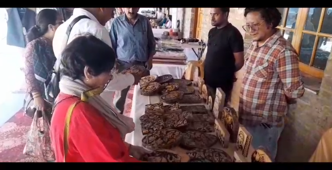 भारत सरकार द्वारा अल्मोड़ा के ऐतिहासिक मल्ला महल में आयोजित “आदि बाजार” में सीमांत क्षेत्र मुनस्यारी के युवा कलाकार हेमंत धरसत्तू की पायरोग्राफी कला इन दिनों दर्शकों के बीच खास आकर्षण बनी हुई है।