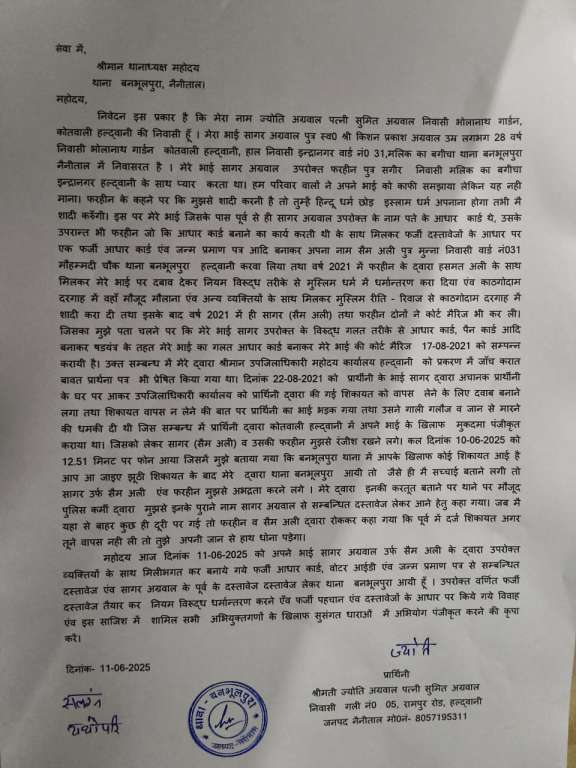 ज्योति अग्रवाल ने बनभूलपुरा पुलिस को सागर के पुराने और कथित फर्जी दस्तावेज सौंपते हुए मांग की है कि धर्म परिवर्तन, फर्जी दस्तावेज तैयार करने, जबरन विवाह और धमकी देने के मामलों में आरोपियों के खिलाफ सुसंगत धाराओं में मुकदमा दर्ज किया जाए।
