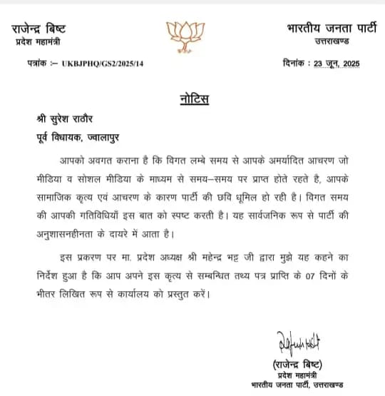 अब निगाहें इस बात पर टिकी हैं कि पूर्व विधायक सुरेश राठौर पार्टी को क्या जवाब देंगे, और भाजपा उनके उत्तर के आधार पर क्या कदम उठाएगी।
