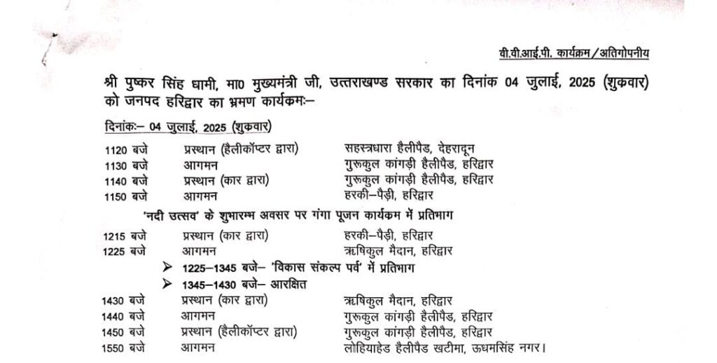गंगा पूजन के बाद मुख्यमंत्री दोपहर 12:25 बजे ऋषिकुल मैदान पहुंचेंगे, जहां वे ‘विकास संकल्प पर्व’ कार्यक्रम में प्रतिभाग करेंगे।