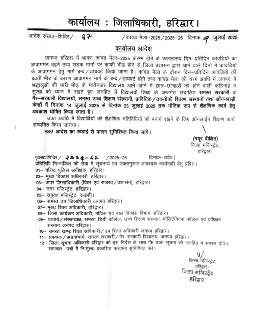 सावन मास में आयोजित होने वाले कांवड़ मेले के चलते हरिद्वार जिला प्रशासन ने 14 से 23 जुलाई तक जिले के सभी शैक्षणिक संस्थानों को बंद रखने का आदेश जारी किया है। यह निर्णय क्षेत्र में बढ़ती भीड़, ट्रैफिक व्यवस्था और बच्चों की सुरक्षा को ध्यान में रखते हुए लिया गया है।