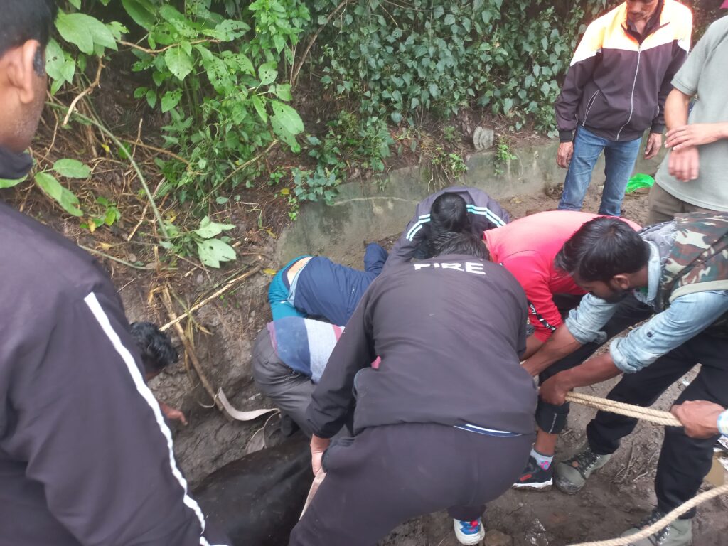 राय स्टेट क्षेत्र के पास एक गाय सड़क किनारे स्थित नाले में गिर गई, जिससे वह बाहर नहीं निकल पा रही थी। घटना की जानकारी मिलते ही फायर स्टेशन रानीखेत को सूचित किया गया। सूचना पर एफएसएसओ रानीखेत के नेतृत्व में फायर सर्विस यूनिट मौके पर पहुंची और स्थानीय लोगों के सहयोग से रेस्क्यू अभियान शुरू किया।
