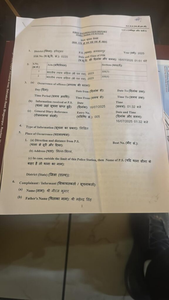 रुड़की के भगवानपुर क्षेत्र में एक फार्मास्युटिकल कंपनी के निदेशक से 25 लाख रुपये की रंगदारी मांगने का मामला सामने आया है। आरोपी ने खुद को एक कथित संगठन का अध्यक्ष बताते हुए कारोबारी को धमकाया और झूठे दस्तावेजों में फंसाने की बात कही। मामला सामने आने के बाद पुलिस ने गंभीर धाराओं में मुकदमा दर्ज कर जांच शुरू कर दी है।