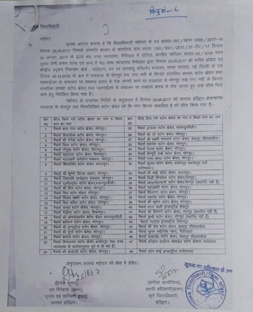 हरिद्वार जिला प्रशासन ने लक्सर से सटे भोगपुर क्षेत्र और आस-पास के इलाकों में संचालित 48 स्टोन क्रशरों को सील करने का दावा किया है। यह कार्रवाई मातृ सदन संस्था द्वारा दाखिल याचिका पर अदालत द्वारा पारित आदेश के अनुपालन में की गई है, जिसमें बाणगंगा नदी के दोनों किनारों पर अवैध खनन को रोकने की मांग की गई थी।खनन गतिविधियों पर पूर्ण विराम