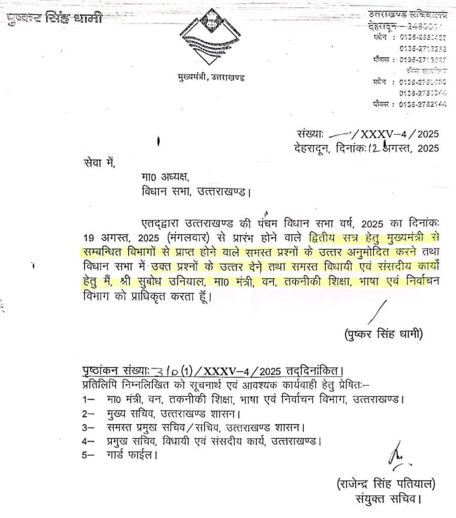 आदेश के तहत सुबोध उनियाल आगामी सत्र में मुख्यमंत्री से संबंधित विभागों के प्रश्नों का उत्तर देने के साथ-साथ अन्य आवश्यक कार्य भी देखेंगे।