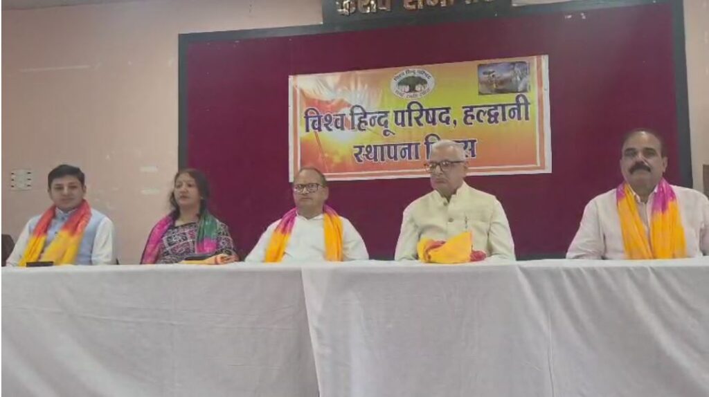 हल्द्वानी के हरगोविंद सोयल विद्यालय सभागार में आज विश्व हिंदू परिषद का स्थापना दिवस बड़े धूमधाम और श्रद्धा भाव के साथ मनाया गया। कार्यक्रम में बतौर मुख्य अतिथि केंद्रीय मंत्री (विश्व हिंदू परिषद) दिनेश उपाध्याय उपस्थित रहे। उनके साथ मंच पर सैंपल पाल चौधरी, रेनू अधिकारी सहित विहिप और बजरंग दल से जुड़े अनेक पदाधिकारी और स्थानीय नेता भी मौजूद रहे।