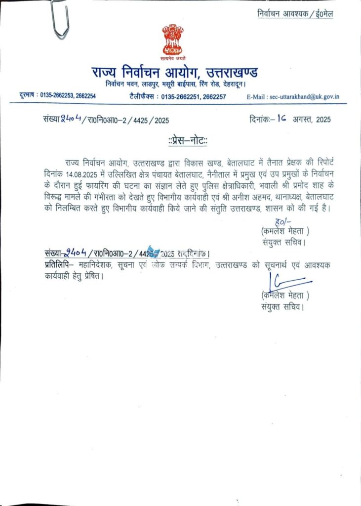 14 अगस्त को हुए चुनाव के दौरान गहमागहमी और कहासुनी के बीच अचानक फायरिंग की घटना सामने आई। इस घटना ने चुनाव प्रक्रिया की पारदर्शिता पर सवाल खड़े कर दिए। मामले की गंभीरता को देखते हुए राज्य निर्वाचन आयोग ने तुरंत संज्ञान लिया और कड़ा रुख अपनाया। आयोग की जांच रिपोर्ट के आधार पर भवाली के पुलिस क्षेत्राधिकारी प्रमोद शाह के विरुद्ध विभागीय कार्रवाई की संस्तुति शासन को भेज दी गई है। वहीं, बेतालघाट थानाध्यक्ष अनीश अहमद को तत्काल प्रभाव से निलंबित करते हुए उनके खिलाफ विभागीय जांच के आदेश जारी कर दिए गए हैं।