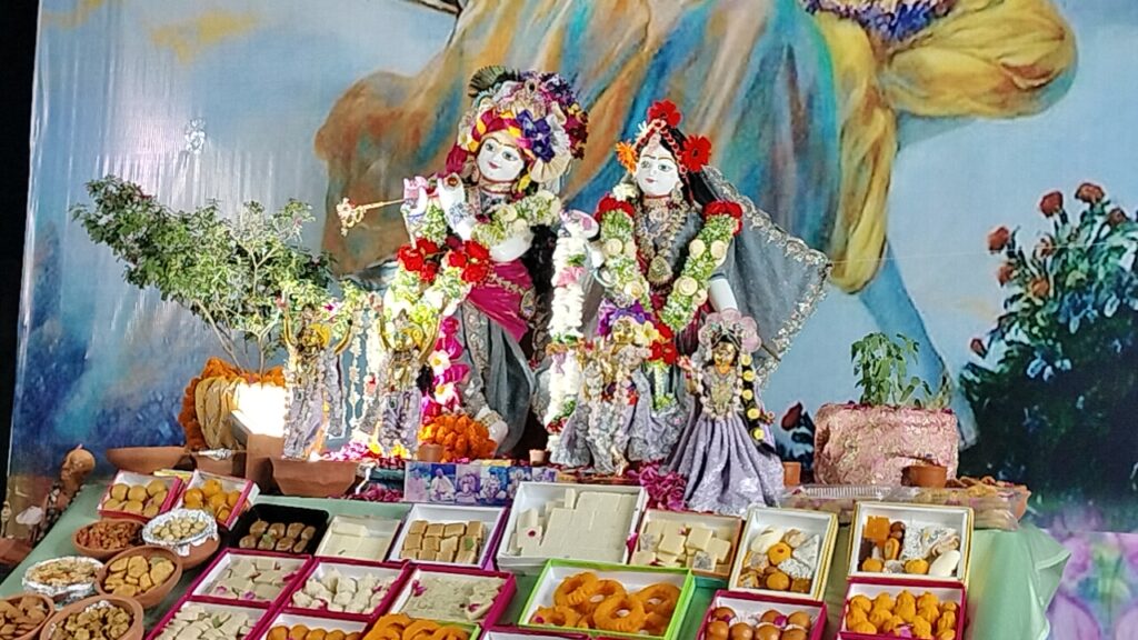 शाम चार बजे से मुख्य कार्यक्रम का शुभारंभ हुआ, जिसमें भक्तों ने श्रीमती राधारानी की स्तुति में भजन गाए और विशेष हरिनाम संकीर्तन किया। इसके बाद राधारानी का पुष्पाभिषेक कर श्री श्री राधा श्याम सुंदर को 108 प्रकार के भोग अर्पित किए गए। कार्यक्रम के दौरान मंदिर परिसर भक्ति और रंग-बिरंगे पुष्पों से सजा दिखाई दिया।