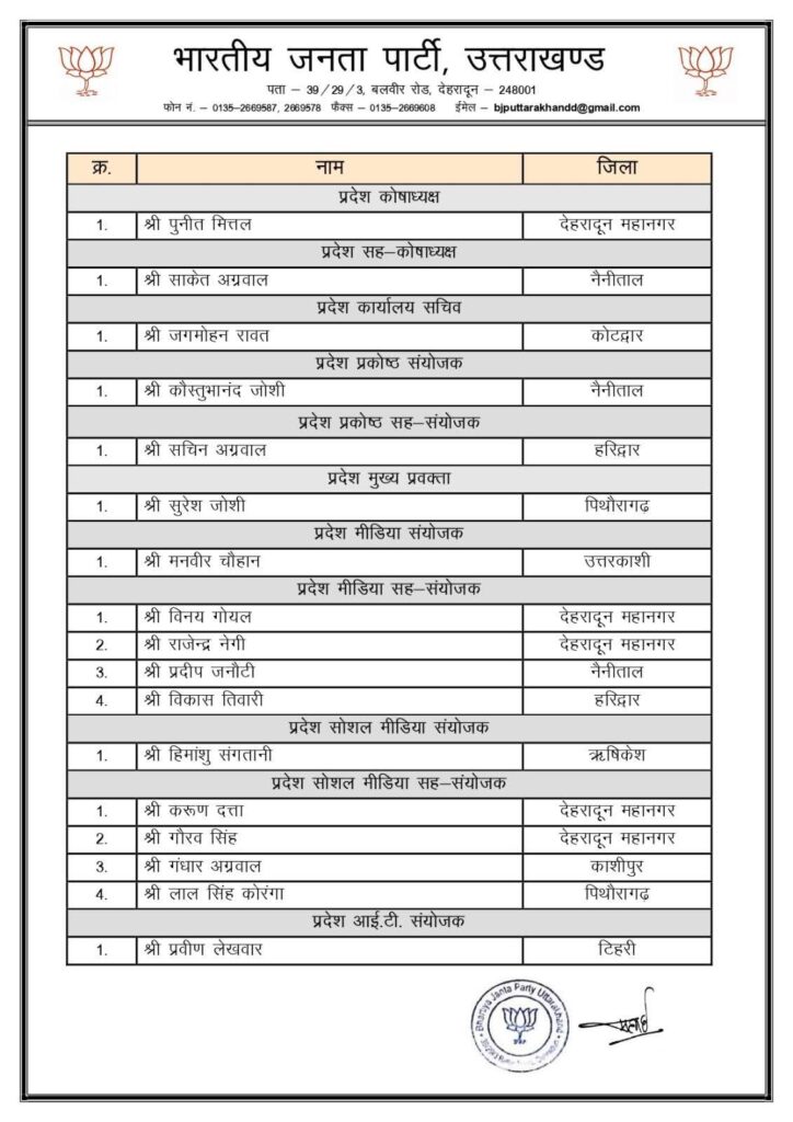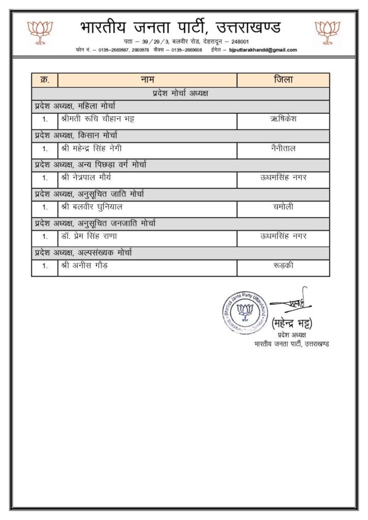 उत्तराखंड भाजपा से आज एक अहम राजनीतिक घटनाक्रम सामने आया है। भाजपा प्रदेश अध्यक्ष महेंद्र भट्ट ने जिलेवार प्रदेश पदाधिकारियों की घोषणा कर दी है। यह घोषणा भाजपा के राष्ट्रीय अध्यक्ष जेपी नड्डा की सहमति के बाद की गई।