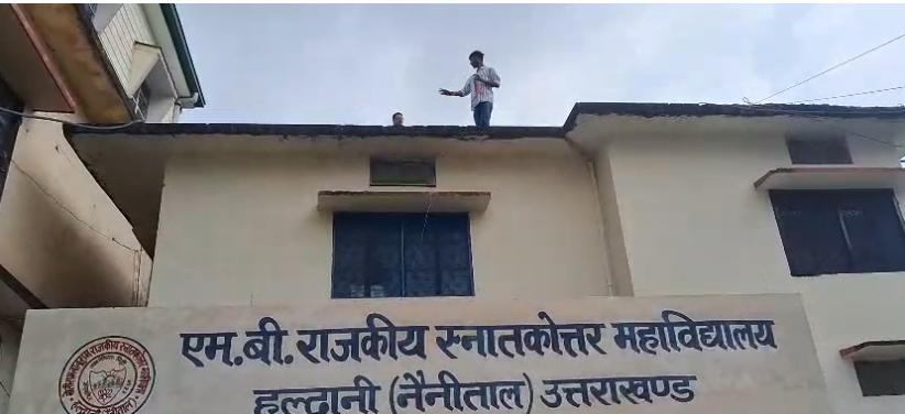 हल्द्वानी। एमबीपीजी कॉलेज में आज छात्र द्वारा छत पर पेट्रोल की बोतल लेकर चढ़ जाने से पूरे परिसर में हाई वोल्टेज ड्रामा मच गया। देखते ही देखते छात्रों और प्राचार्य के बीच झड़प होने लगी, जिससे कॉलेज प्रशासन और अन्य छात्रों में अफरा-तफरी फैल गई।