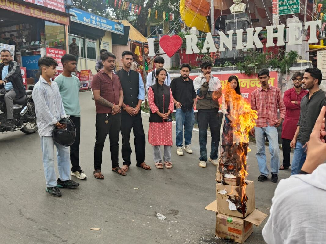 यूकेएसएसएससी स्नातक स्तरीय पटवारी भर्ती परीक्षा में एक बार फिर पेपर लीक की खबर सामने आने के बाद रानीखेत में छात्रों का गुस्सा फूट पड़ा। सोमवार को रानीखेत महाविद्यालय के छात्र-छात्राओं ने गांधी चौक पर विरोध प्रदर्शन करते हुए प्रदेश सरकार का पुतला फूंका और जमकर नारेबाजी की।