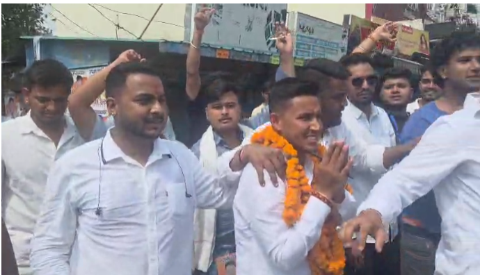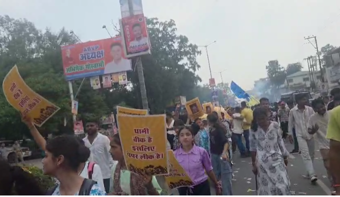 हल्द्वानी: एमबीपीजी कॉलेज में नामांकन प्रक्रिया पूरी होने के बाद अध्यक्ष पद के प्रत्याशियों ने अपनी ताकत का प्रदर्शन करने के लिए जुलूस निकाले। एबीवीपी के प्रत्याशी अभिषेक गोस्वामी ने नवरात्रि के दौरान चल रही नवदुर्गा की झांकी लेकर जुलूस निकाला, जबकि निर्दलीय प्रत्याशी कमल बोरा ने महाकाल की झांकी के साथ अपने समर्थकों के साथ रैली की।