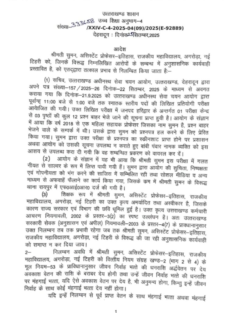 इस आदेश के तहत हरिद्वार के उस परीक्षा केंद्र के सेक्टर मजिस्ट्रेट केएन तिवारी को तत्काल प्रभाव से निलंबित कर दिया गया है।