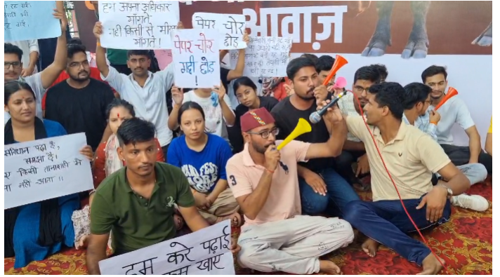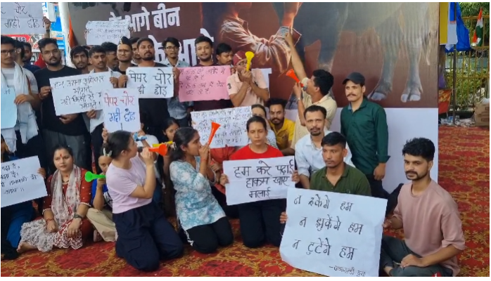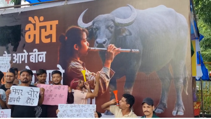 हल्द्वानी। पेपर लीक प्रकरण को लेकर हल्द्वानी में बेरोजगार युवाओं का धरना-प्रदर्शन लगातार जारी है। आज बुद्ध पार्क में प्रदर्शन कर रहे युवाओं ने विरोध जताने के लिए अनोखे अंदाज़ अपनाए। उन्होंने भैंस का पोस्टर लगाकर बीन बजाई और राज्य सरकार को जगाने का प्रयास किया। प्रदर्शनकारियों ने असल भैंस लाने की कोशिश भी की, जिसे पुलिस और प्रशासन ने रोक दिया।