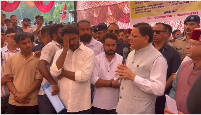देहरादून। UKSSSC पेपर लीक प्रकरण को लेकर बेरोजगार संघ और युवा लगातार सड़कों पर प्रदर्शन कर रहे हैं। देहरादून के परेड ग्राउंड के पास बेरोजगार संघ पिछले आठ दिनों से धरना दे रहा था। आज मुख्यमंत्री पुष्कर सिंह धामी खुद छात्रों के बीच पहुंचे और इस मामले में CBI जांच की संस्तुति देने की घोषणा की।