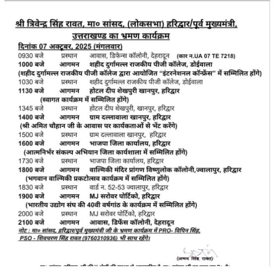 - 4:00 बजे: हरिद्वार भाजपा जिला कार्यालय में आयोजित आत्मनिर्भर संकल्प अभियान जिला कार्यशाला में भाग लेंगे।