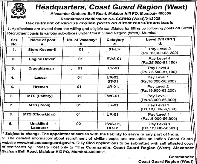 इच्छुक अभ्यर्थी ऑफलाइन आवेदन पत्र Headquarters, Coast Guard Region (West), Alexander Graham Bell Road, PO Malabar Hill, Mumbai-400006 पर भेज सकते हैं। आवेदन पत्र के साथ 50 रुपये का पोस्टल स्टाम्प भी संलग्न करना अनिवार्य है।