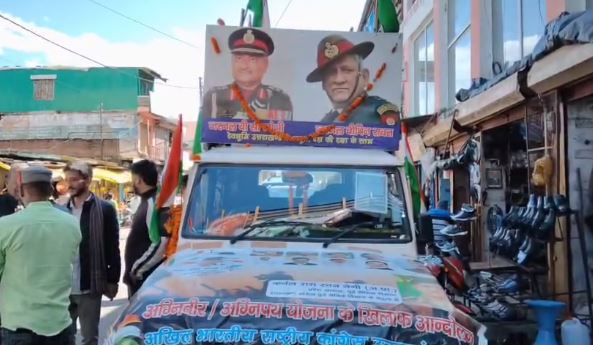 कांग्रेस पूर्व सैनिक विभाग के प्रदेश अध्यक्ष कर्नल राम रतन नेगी के नेतृत्व में बुधवार को एजेंसी चौक से बस अड्डा तक अग्निवीर भर्ती के विरोध में जन जागरण रथ यात्रा आयोजित की। इसमें पूर्व सैनिकों और कांग्रेस कार्यकर्ताओं ने बढ़-चढ़ कर हिस्सा लिया और केंद्र सरकार के खिलाफ नारेबाजी की।